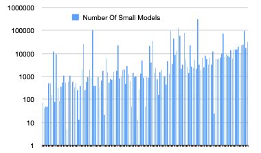 The figure below shows the number of small models trained in Tursio to build the semantic knowledge graph for each of the 137 real-world databases. We see 10s to 100s of thousands of small models needed to accurately capture the semantics on real-world databases. Together, these small models capture name simplifications, join relationships, table and column descriptions, ontologies, default measures, aspects, aliases, PIIs, and so on.