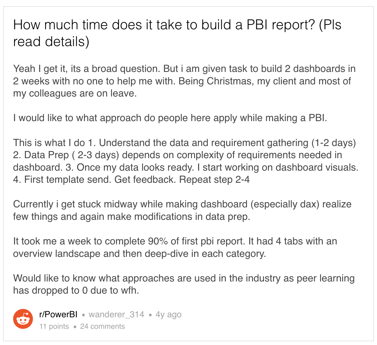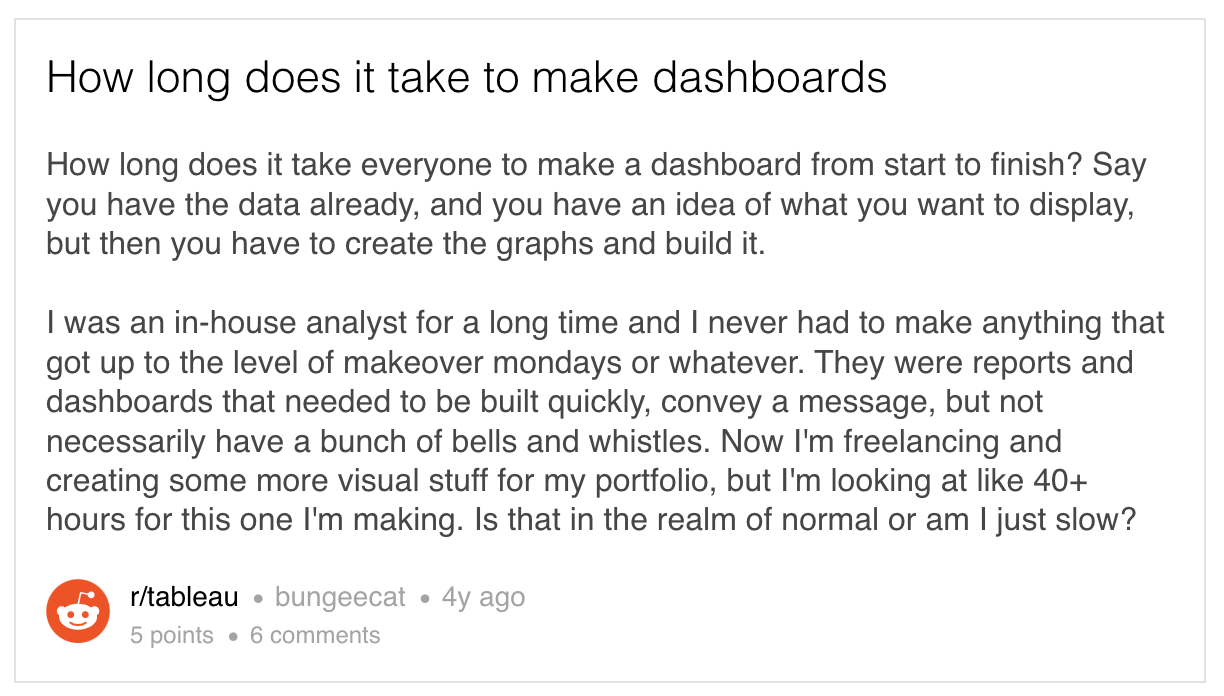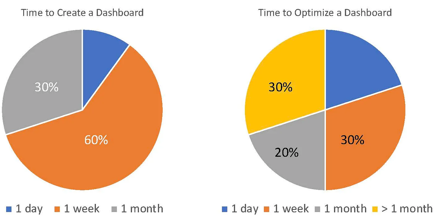 Ninety percent of the people take 1 week or more to create a dashboard, and eighty percent of the people take 1 month or more to optimize their dashboards. This is after the data has already landed in a data warehouse. While this was shocking to us initially, more application builders corroborated such an experience in our interviews. Infact, a quick search on the internet also reveals a similar ordeal that people must go through:
