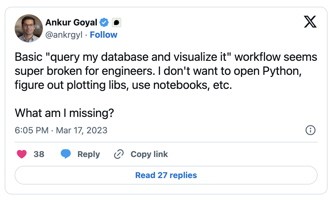 Figma is a great example of development teams first figuring out “what” they want and iterating on the wireframe before fleshing it out. As a result, with Figma, product manages can first run mockups by the end users, understand whether their requirements are captured, and iterate on it several times before the dev teams start integrating it in the backend. Unfortunately, a Figma like approach for data analytics is missing where analysts could visualize what they want first before fiddling with the complex data models and workflows.