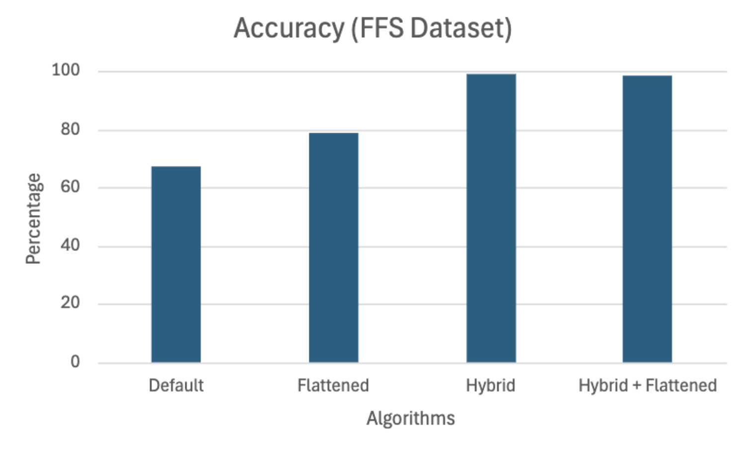 We see that the default hierarchical predictor has lower accuracies of 67.35% and 60% on FFS and production datasets, respectively. However, the accuracy improves significantly with flattened and hybrid variants of the algorithm. For the FFS dataset, accuracies reached 99% and 98.63%, while for the production dataset, the accuracies were 98.3% and 98.6%. These are promising numbers with measurable improvements in accuracy.