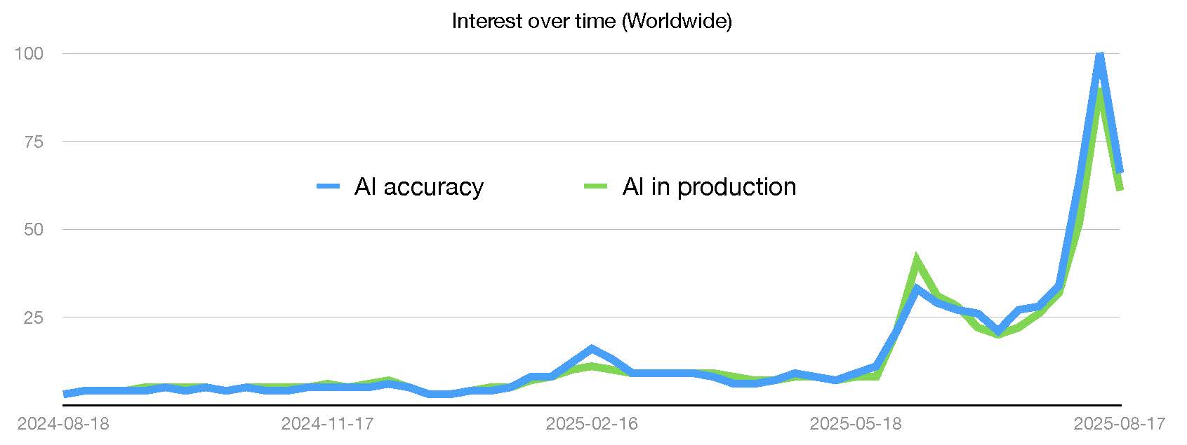 Considering Google Trends as a proxy, the graphic below shows the interest in "AI in production" over the last one year (green curve). We can see an astronomical rise in this topic in the recent months. Co-incidentally, this is matched, nearly pixel by pixel, by interest in "AI accuracy" (blue curve). Is this a mere co-incidence that people are suddenly interested in accuracy just as they are interested in getting AI to production?